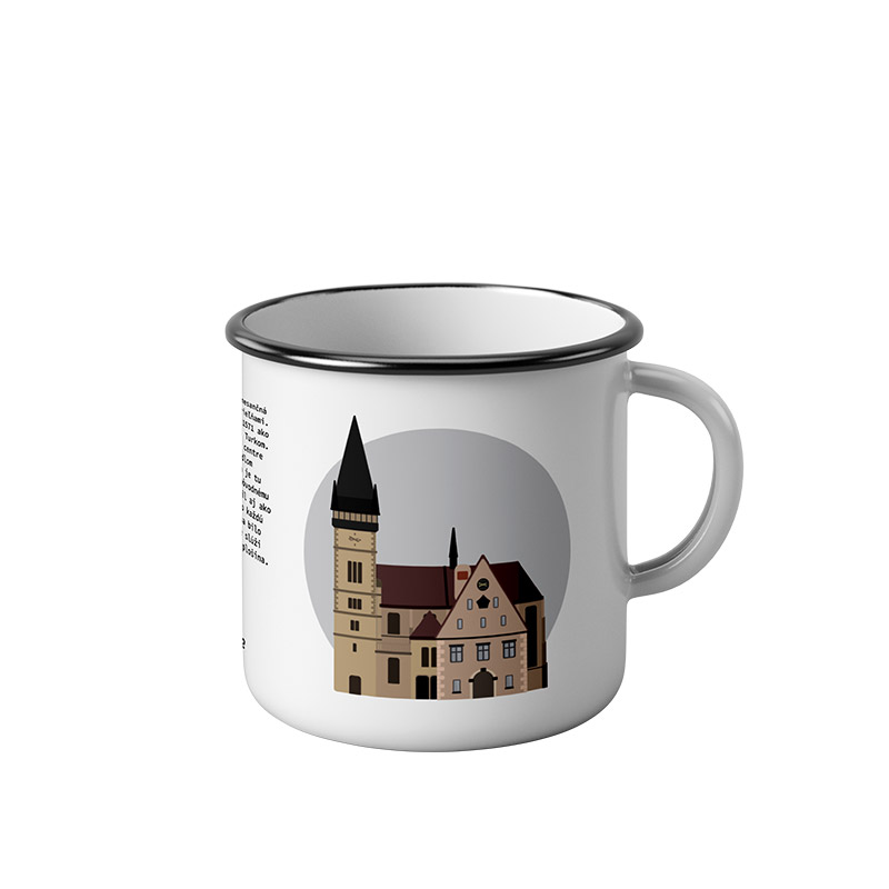 - Smaltovaný hrnček bielej farby s horným čiernym okrajom a farebným motívom.